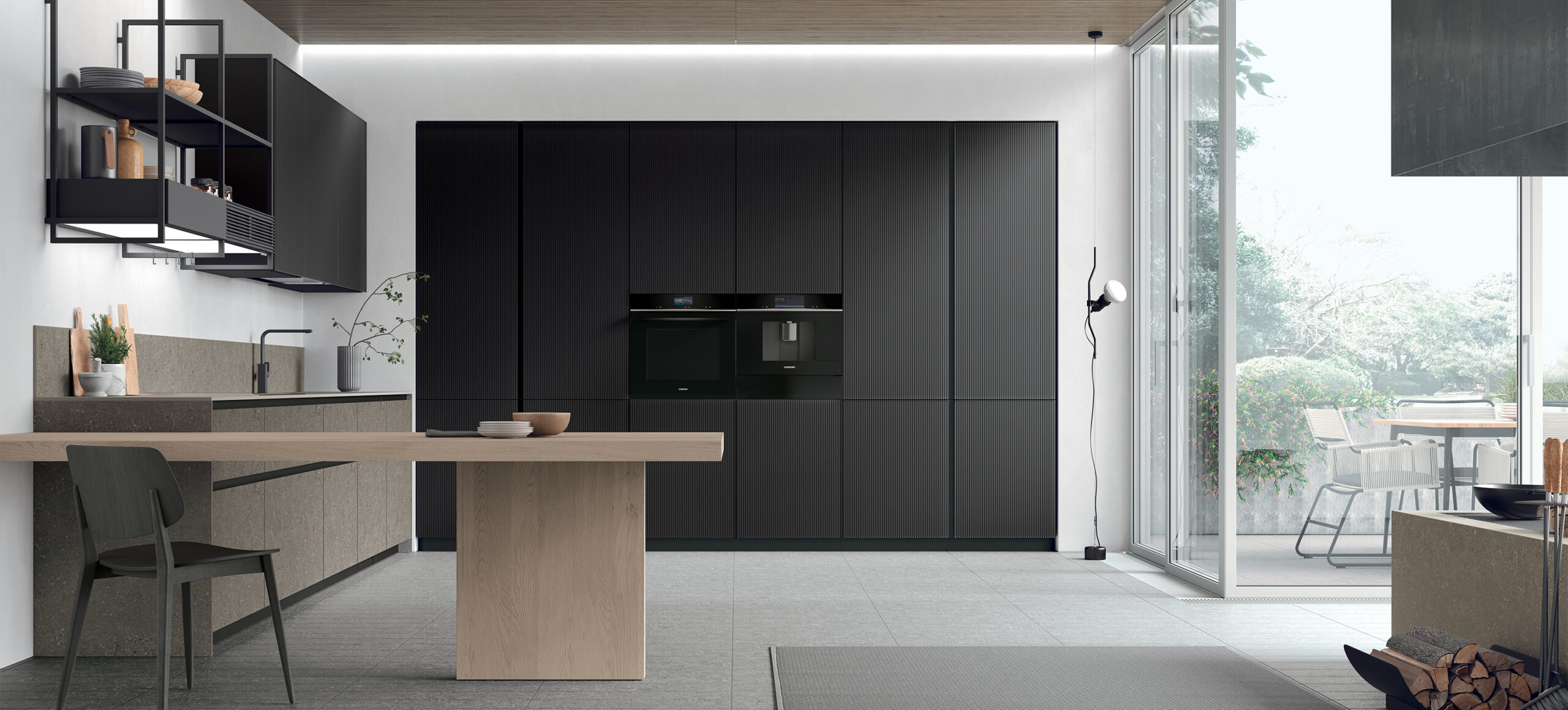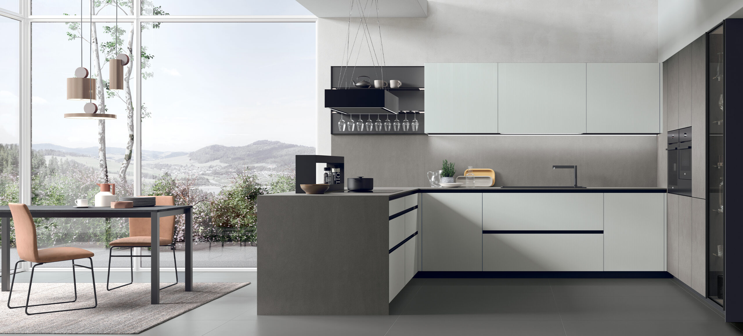 Connubio di estetica e organizzazione, la nuova Aliant si presta a una pluralità di linguaggi espressivi, riuscendo a dare vita a molteplici soluzioni: dalle isole scenografiche, rivestite in HPL alle raffinate cucine lineari esaltate dalla trasparenza del vetro, sino a soluzioni di grande fascino che dialogano con il living.